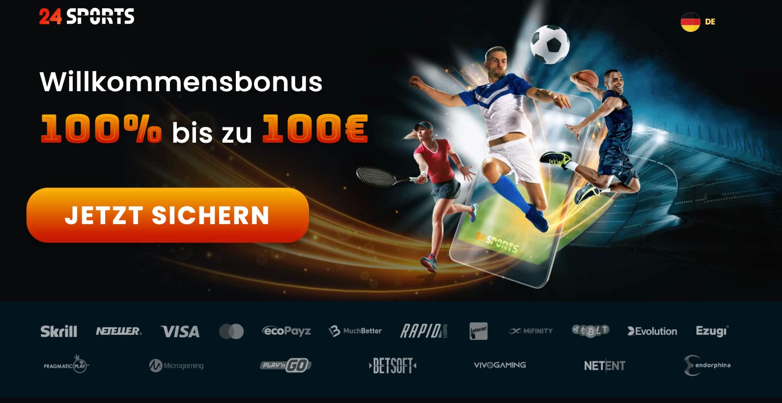 Dieser umfasst 100% Deiner ersten Einzahlung bis zu einem Betrag von 100€. Nutze den Bonuscode “SPORT” bei Deiner ersten Einzahlung, um den 24Sports Sportwetten Bonus zu aktivieren. Der Bonusbetrag und die daraus resultierenden Gewinne müssen innerhalb von 14 Tagen 10 mal umgesetzt werden.