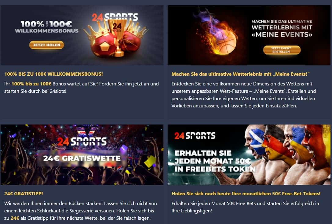 Der 24Sports Willkommensbonus für neue Spieler beträgt derzeit 100% auf die Ersteinzahlung bis zu einem maximalen Betrag von 100€. Zusätzlich gibt es auch regelmäßig verschiedene Aktionen und Boni für treue Spieler.