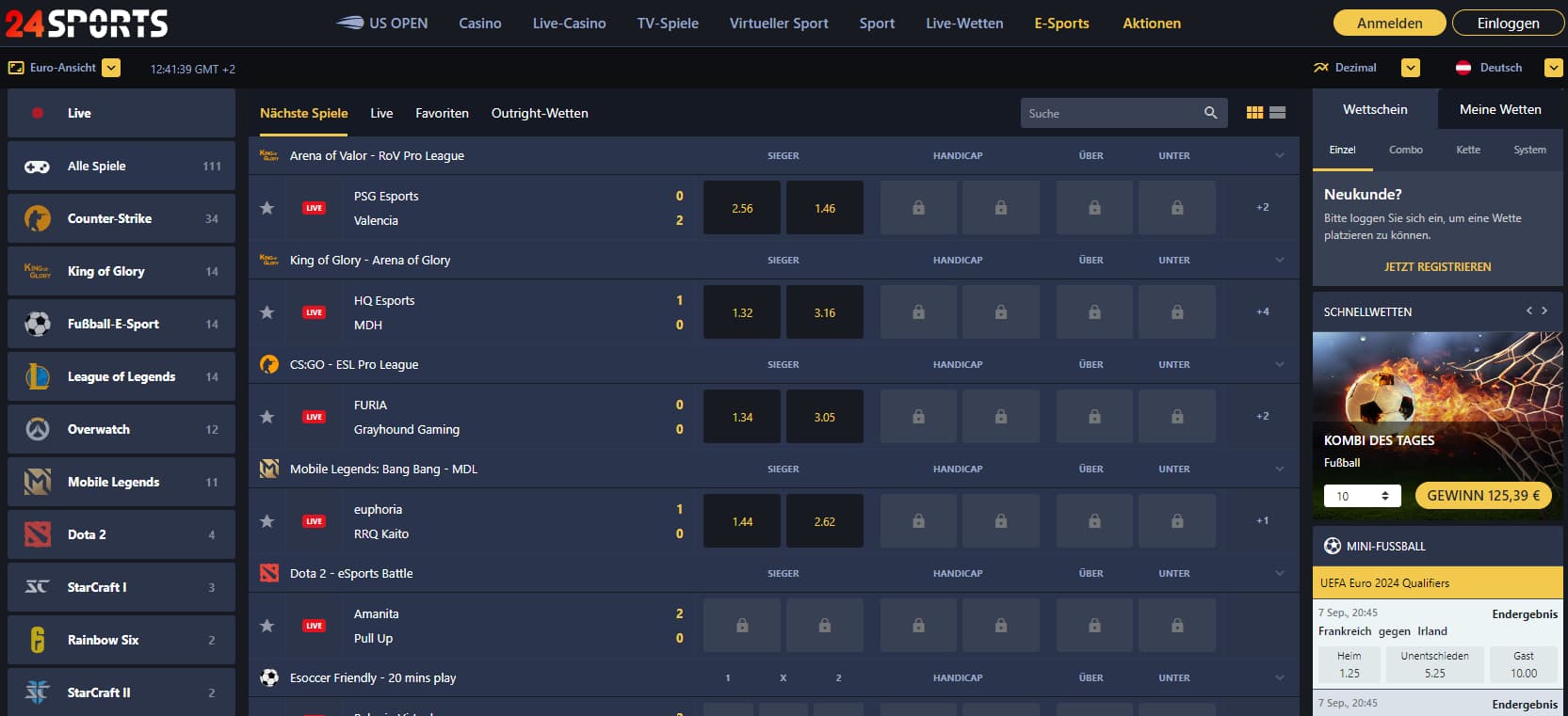 ESports: 24Sports bietet beliebte Titel wie Counter-Strike: Global Offensive, Dota 2 und League of Legends. Mit Live-Wetten auf E-Sport Turniere können Wettbegeisterte ihre Fähigkeiten unter Beweis stellen und sich gleichzeitig auf unterhaltsame Weise mit der E-Sports-Community verbinden.