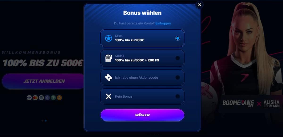 Unmittelbar nach der Registrierung werden Sie im Browser zur ersten Einzahlung weitergeleitet. Wählen Sie Ihre bevorzugte Zahlungsart aus und geben Sie den gewünschten Betrag ein. Bedenken Sie dabei, dass sich die Höhe Ihrer ersten Einzahlung auch auf den Boomerang Bet Sportwetten Bonus auswirken kann und beachten Sie die Mindest- und Höchstlimits bei der jeweiligen Zahlungsart.