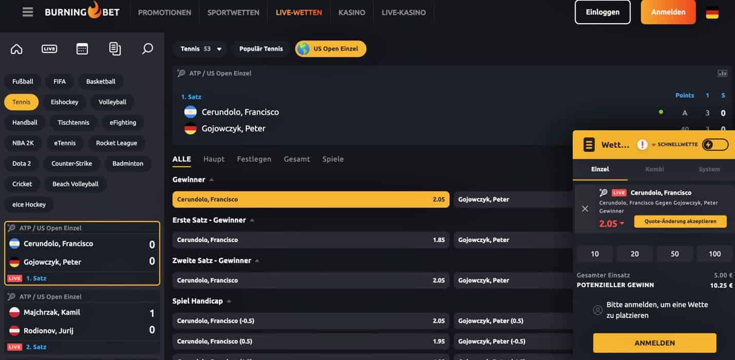 Im Live-Bereich konnten wir in unserem BurningBet Sportwetten Test aus den Sportarten Fußball, Tennis, Basketball, Tennis, Volleyball, Handball, Tischtennis, eFighting, NBA, eTennis, Rocket League, Squash, League of Legends und Cricket wählen. Das Angebot kann sich auch mal ändern, denn es hängt ganz davon ab, welche Spiele aktuell eben live stattfinden.