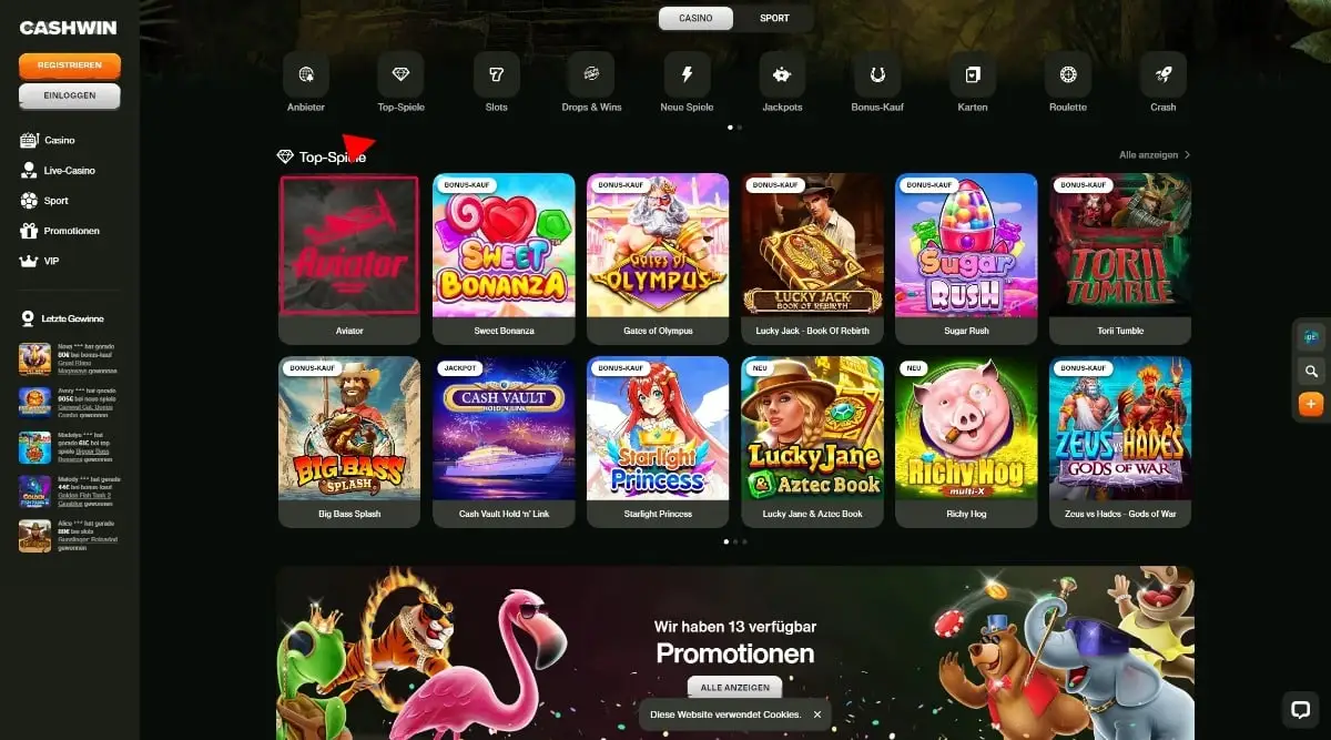Das Cashwin Casino verdient eine klare Empfehlung von uns. Spieler, die Slots lieben, kommen hier besonders auf ihre Kosten. Die Spielautomaten sind nicht nur thematisch sortiert, sondern können auch nach Spieleanbieter gefiltert werden. Von diesen gibt es über 50 Stück, wobei Namen wie Pragmatic Play, Play’n Go, Spinomenal, Netent oder Relax Gaming nicht fehlen dürfen. Bücherslots, Jackpot-Slots, Bonuskauf oder Megaways Spielautomaten sind vorhanden. Mit stattfindenden Turnieren und vielen Bonusangeboten überzeugt das Casino auf ganzer Linie.