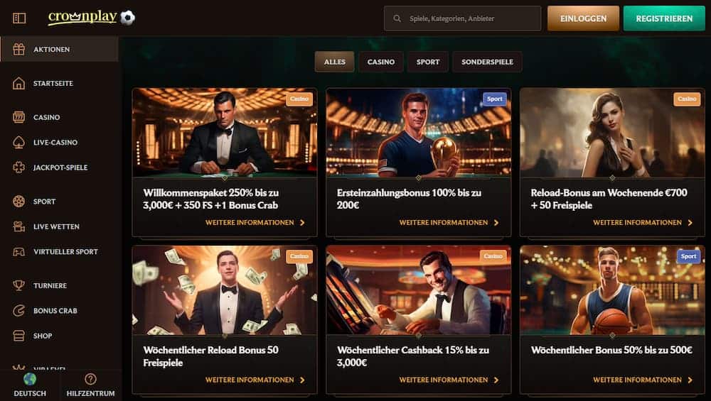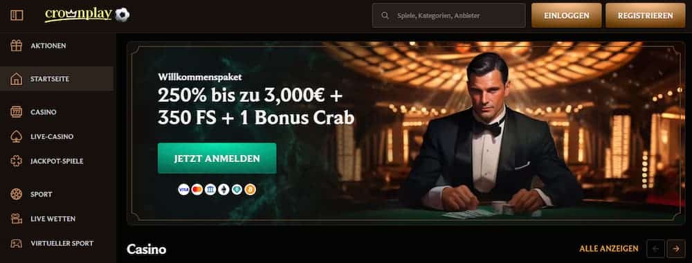 Der Crownplay Bonus für das Casino besteht aus mehreren Vorteilen. Die erste Einzahlung auf das Spielkonto wird um 250 % bis zu einem Wert von 3.000 € aufgestockt. Das ist eine Menge! Außerdem kommen 350 Freispiele sowie eine Bonus Crab dazu und komplettieren das attraktive Angebot. Ein Live Cashback, der Reload-Bonus am Wochenende oder aber auch das wöchentliche Cashback bis zu 3.000 € runden den Bereich ab.