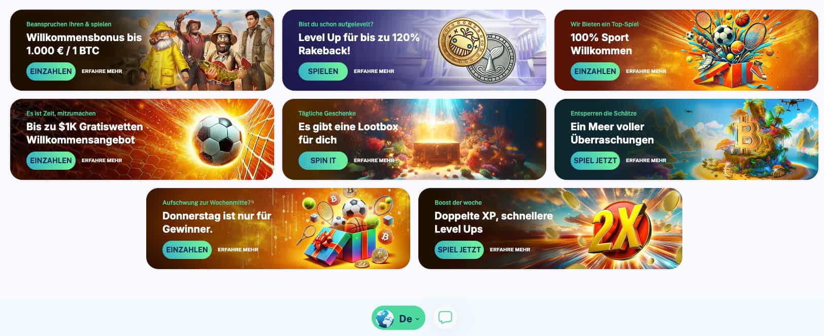 Ein Bereich mit DailySpins Live Wetten ist ebenfalls vorhanden, heißt bei diesem Online Buchmacher aber “In-Play”. Die Zahlungsarten decken ein paar Fiat-Methoden und Kryptowährungen ab. Nach unserem Geschmack hätte das Angebot an Fiat-Zahlungsmitteln aber schon ein wenig größer ausfallen dürfen. Abgerundet werden die insgesamt sehr guten DailySpins Erfahrungen mit einem top Casinoangebot.