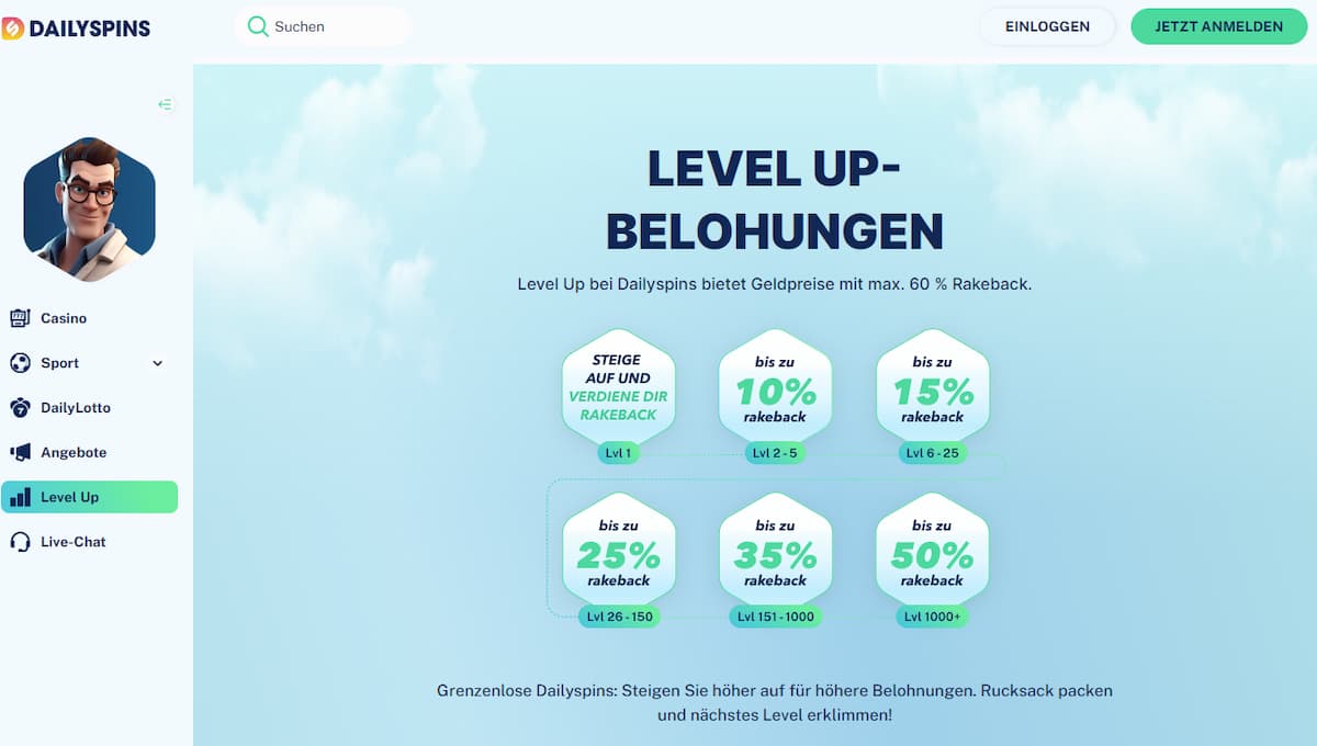 Der DailySpins Casino Bonus hat uns ebenfalls sehr gut gefallen. Neukunden haben die Chance auf bis zu 1.000 € auf die erste Einzahlung. Die erste Einzahlung wird hierbei verdoppelt. Der Neukundenbonus wird außerdem durch 200 Freispiele ergänzt. Unterschiedliche Bestandskundenangebote und ein VIP-Programm, das einige Vorteile bietet, gibt es ebenfalls.