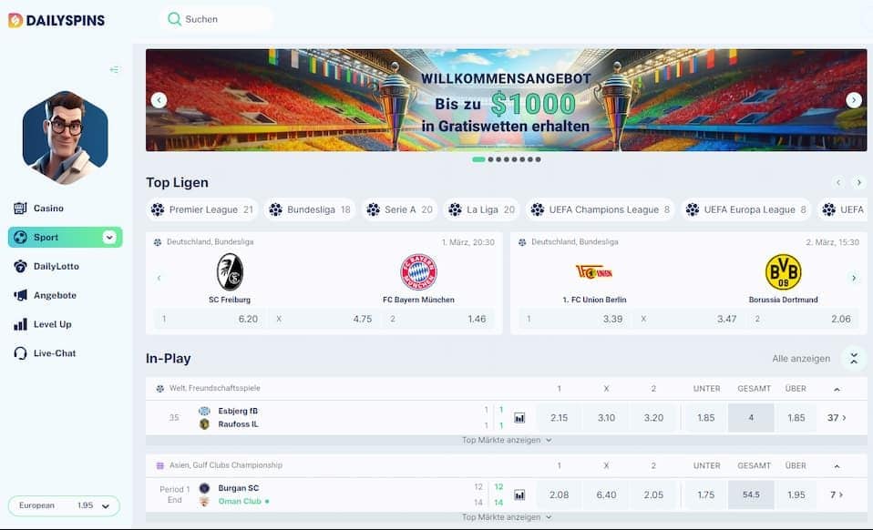 Besonders populär bei Live Wetten sind DailySpins Fußball und DailySpins Tennis. Aber auch die anderen Sportarten werden sehr gut abgedeckt.