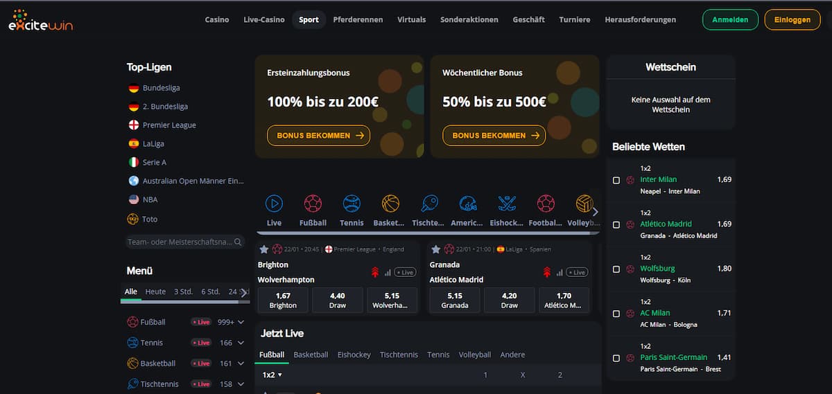 Die Frage, wie die Excitewin Erfahrungen mit dem verfügbaren Wettangebot ausfallen, ist natürlich ebenfalls enorm wichtig. Schließlich willst du hier einerseits auf deinen Lieblingssport wetten können. Andererseits sollte aber auch jederzeit für möglichst viel Abwechslung gesorgt werden. Und hier haben wir nun besonders gute Neuigkeiten für dich.