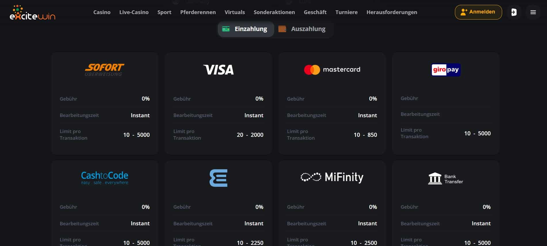 Bevor du damit beginnen kannst, Wetteinsätze abzugeben und somit für Excitewin Erfahrungen und Gewinne zu sorgen, musst du natürlich zunächst dein Wettkonto mit Guthaben befüllen. Daher haben wir uns das Zahlungsportfolio des Anbieters genau angeschaut. Zunächst einmal gibt es Pluspunkte, weil du die entsprechenden Informationen uneingeschränkt einsehen kannst, ohne dich vorher anzumelden. Das sorgt für maximale Transparenz.