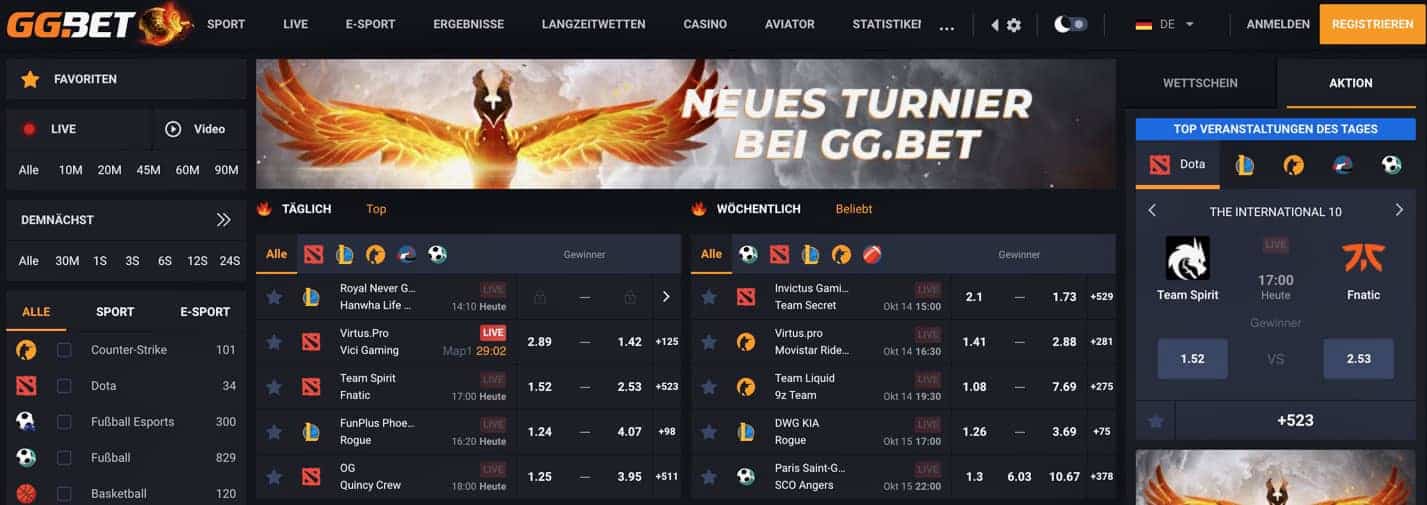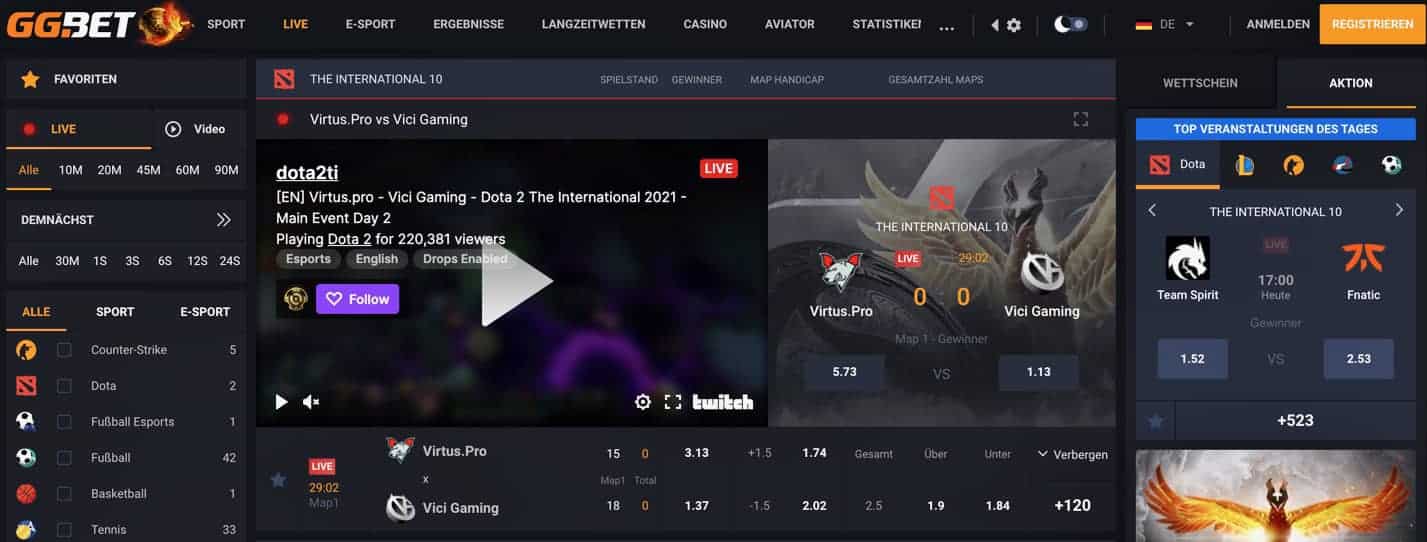 Einen besonderen Fokus legt GG.Bet auf eSports. Nutzer können unter anderem auf Turniere und Spiele in Titeln wie Counter-Strike, Fortnite, Dota, League of Legends, Warcraft III und StarCraft 2 wetten.