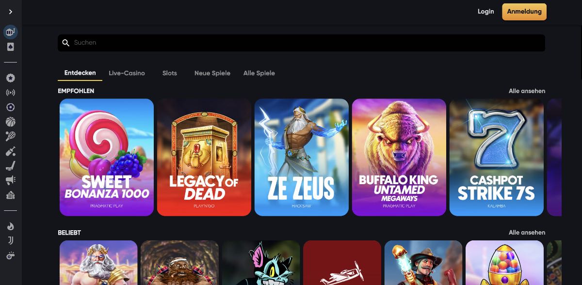 Es ist im Instant Casino Test nicht möglich, alle Top-Slots aufzuführen. Als Beispiele sollen Book of Ra Deluxe, Zeus vs. Hades, Buffalo Trail, Book of Deal, Sugar Rush 1000, Rip City, Chaos Crew 2 und Coins of Ra stehen. Einfache Spiele wie Aviator, Dice und Plinko runden das Spielvergnügen ab.