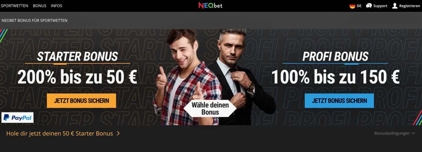 Punkten kann der neue Anbieter aber im Bereich Willkommensbons und weitere Aktionen. Zunächst einmal gibt es die Wahl zwischen dem Starter Bonus, der ein 200% Bonus bis 50 Euro ist und einem Profi-Bonus, der ein 100% Bonus bis 150 Euro ist. Hier wird also jeweils ein passendes Angebot für Tipper gewährt, die eine kleinere Einzahlung oder eine etwas größere Einzahlung tätigen wollen. Zusätzlich sind die Umsatzbedingungen hier sehr fair gewählt. Der Support kann ebenfalls punkten, auch wenn hier vor allem nur auf den Live Chat gesetzt wird. Dieser ist aber gut und auch auf Deutsch erreichbar. Der FAQ-Bereich darf mit der Zeit noch ausgebaut werden. Und auch was die Sicherheit betrifft, müssen sich Spieler hier keine Gedanken machen. Der Anbieter verfügt über eine legale Lizenz, eine SSL-Verschlüsselung und trifft zudem weitere Vorkehrungen zum Spielerschutz. Sammeln Sie Ihre eigenen NeoBet Erfahrungen, testen Sie den Newcomer in der Sportwettenbranche selbst und sichern Sie sich einen der beiden Willkommensboni und lesen Sie NeoBet Meinungen online.