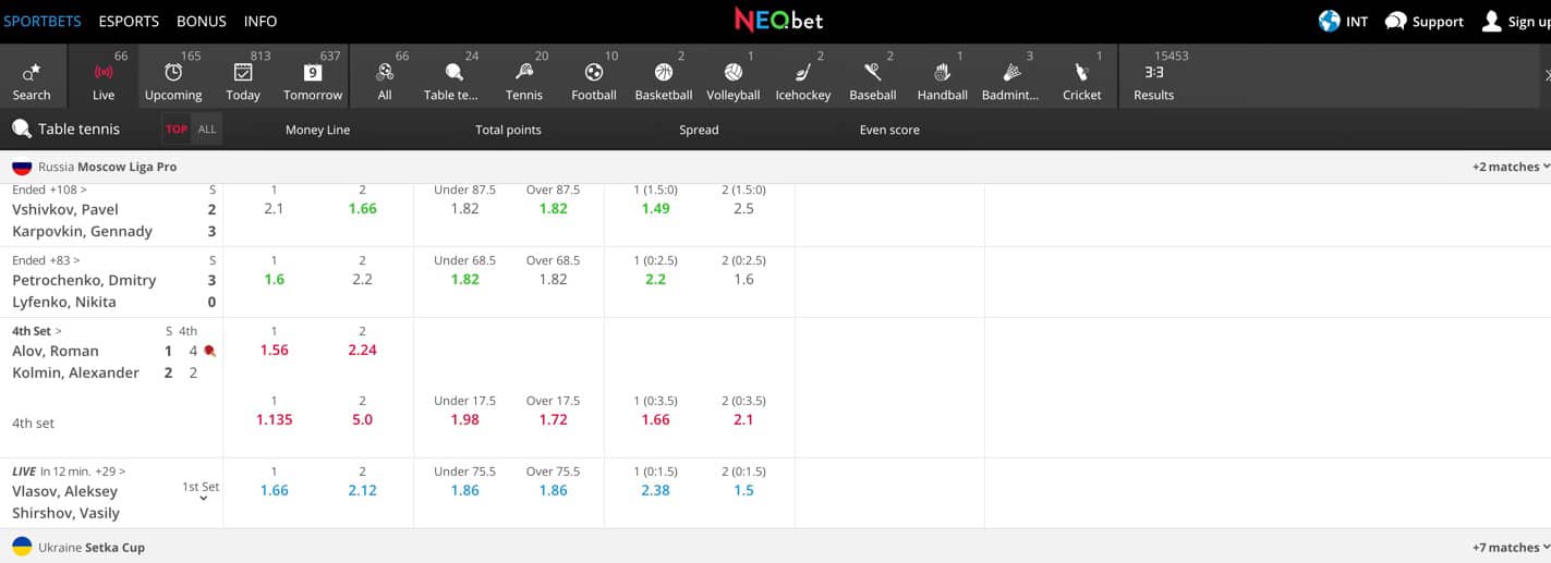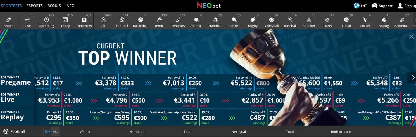 Da es sich bei NEO.bet noch um einen recht jungen Anbieter handelt, konzentriert sich dieser aktuell noch auf die wichtigsten Sportarten. Gerade in den Anfängen ist dies aber keine schlechte Strategie. So finden Tipper hier ein Angebot für die Sportarten Fußball, Tennis, Basketball, Eishockey, Handball, Volleyball, American Football, Baseball, Snooker, Darts, Cricket, Rugby und Boxen. Gerade im Bereich Fußball findet sich ein riesiges Angebot an Wetten, die die Anzahl von 1.000 locker übersteigt. Darunter zu finden sind zahlreiche Sonderwetten, die das Wetten noch spannender gestalten. Damit macht allein das Wettangebot an Fußball mehr als die Hälfte der gesamten Wetten aus. Bei den anderen Sportarten liegt die Wettauswahl meist bei unter 100, im Bereich Eishockey werden oftmals noch mehr als 100 Wetten angeboten. Die Auswahl an Sonderwetten ist hier zwar lange nicht so groß wie beim Fußball, dennoch wird eine zufriedenstellende Auswahl angeboten. Live Wetten werden ebenfalls angeboten, hierauf werden wir im späteren Verlauf jedoch noch genauer eingehen.
