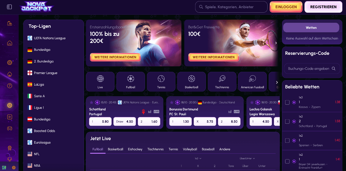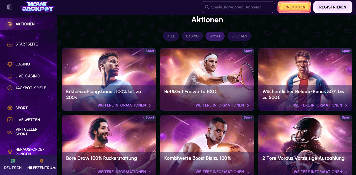 Die NovaJackpot Erfahrungen rund um Sportwetten haben bei uns einen guten Eindruck hinterlassen. Der Willkommensbonus ist stark, was auch für das NovaJackpot Wettangebot gilt. Es gibt viele NovaJackpot Wetten, Wettmärkte, Ligen und Wettbewerbe.