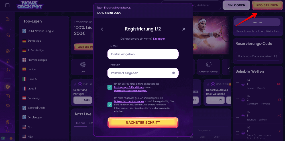 Damit Sie NovaJackpot Sportwetten in Angriff nehmen können, müssen Sie zunächst ein Wettkonto erstellen. Die erforderlichen Schritte erklären wir Ihnen nachfolgend.