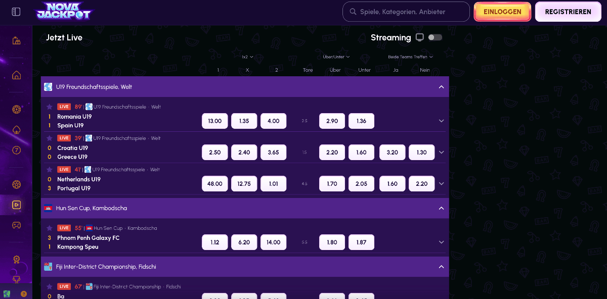 Zwar haben wir im Rahmen unserer NovaJackpot Erfahrungen keinen Kalender gefunden, mit dem Sie die Live Wetten planen können – dafür gibt es aber bei einigen Events einen Schieberegler, mit dem Sie Live Streams Wetten aktivieren können. In unserer NovaJackpot Bewertung sorgt diese Funktion für Pluspunkte, da Sie so bei Live Wetten noch näher am Geschehen sind.
