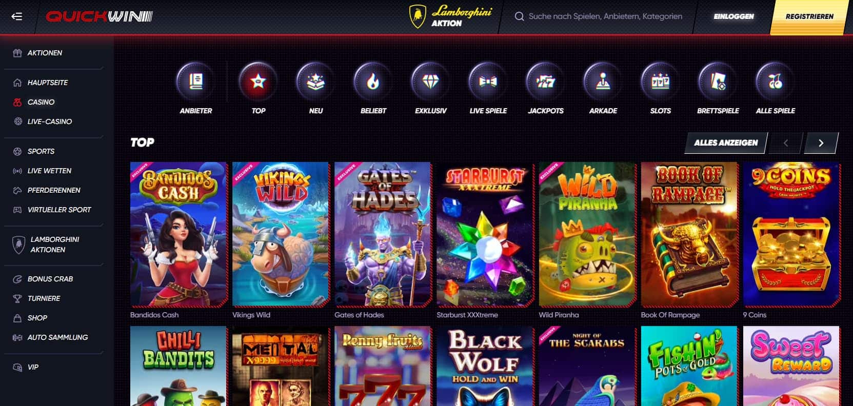 Gegen Ende unseres Quickwin Tests haben wir noch einen kurzen Abstecher in den Casino Bereich gemacht. Unsere Erfahrungen mit dem Quickwin Casino sind durchweg positiv, denn was uns dort erwartet hat, kann sich sehen lassen. Quickwin behauptet sich definitiv im Online Casino Vergleich Deutschland. Slots in Hülle und Fülle von über 100 verschiedenen Spieleherstellern, die fein säuberlich in mehrere Kategorien aufgeteilt sind. Fans von Megaways Slots und Jackpot Automaten werden in diesem Casino definitiv auf ihre Kosten kommen. Darüber hinaus bietet das Casino Arcade Spiele an, sowie Tischspiele, unter denen Blackjack, Roulette, Poker und Baccarat die Dauerbrenner sind.