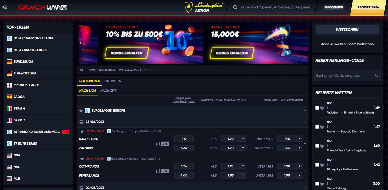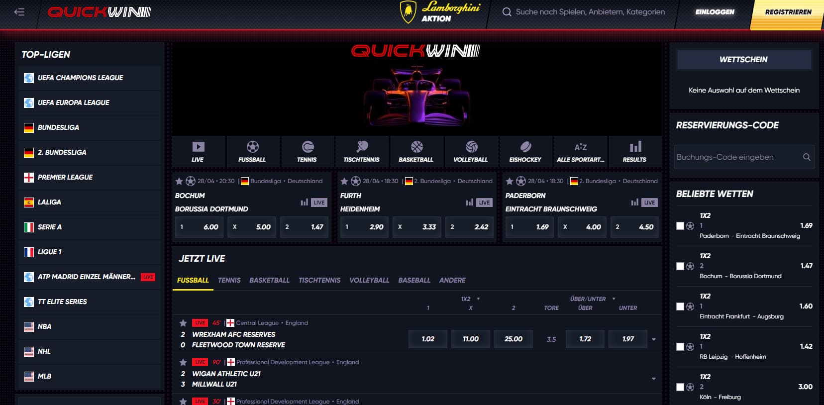 Das Quickwin Live Wetten Angebot ist ebenfalls etwas, was Sie sich nicht entgehen lassen sollten. Auch wenn nicht jede Sportart Live Wettoptionen anbietet, sind Quickwin Fußball, Quickwin Tennis und Co. natürlich vertreten.