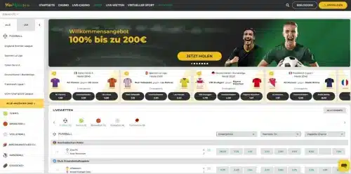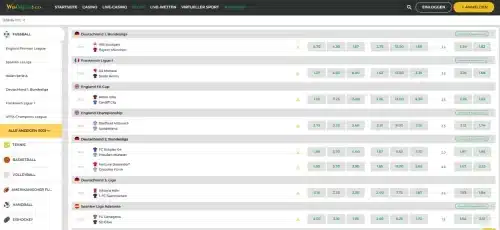 Sobald Sie Ihr Konto registriert und eingezahlt haben, können Sie auf Supabet wetten. Auf der Supabet-Seite können Sie leicht erkennen, wie die Plattform in mehrere Spalten gegliedert ist. In der linken Spalte sehen Sie dann etwa die Top-Ligen im Bereich Fußball. Wählen Sie dann die gewünschte Wette aus, und im zentralen Teil der Plattform sehen Sie die verschiedenen Ereignisse – z. B. Fußballspiele oder Formel-1-Rennen -, auf die Sie wetten können.