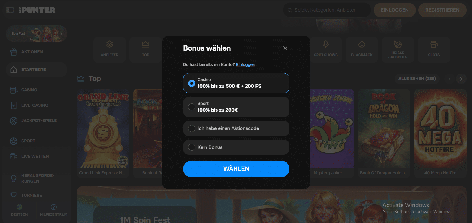 Bei Supabet können Sie einen großzügigen Willkommensbonus von 100 % Ihrer ersten Einzahlung, bis 200 € genießen. Außerdem haben Sie die Möglichkeit, einen 10%igen Bonus zu erhalten, den Sie bekommen, wenn Sie eine virtuelle Sportwette von 20 € oder mehr platzieren. Dieser Bonus ist eine Gratiswette. Schon bei Ihrer ersten Casino-Einzahlung von mindestens 20 € erhalten Sie einen 100 %-Bonus bis zu 500 € sowie 200 Freispiele für Spielautomaten.