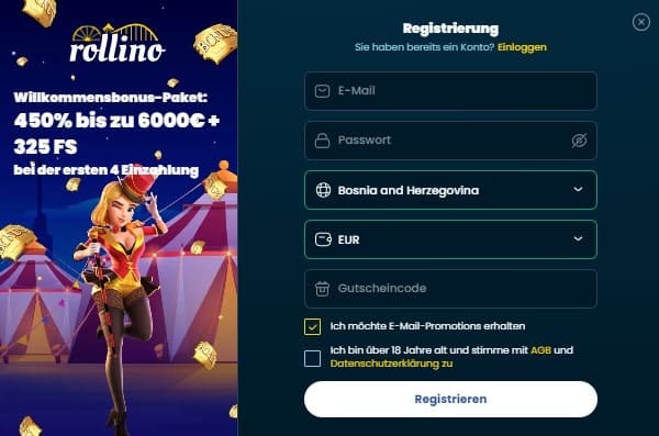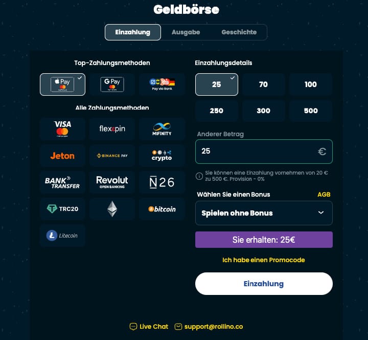 In weiterer Folge werden Sie aufgefordert, Ihre erste Einzahlung vorzunehmen. Unsere detaillierten Erfahrungen mit Rollino zu diesem Thema finden Sie im Abschnitt ” Ein- und Auszahlungen bei Rollino”.