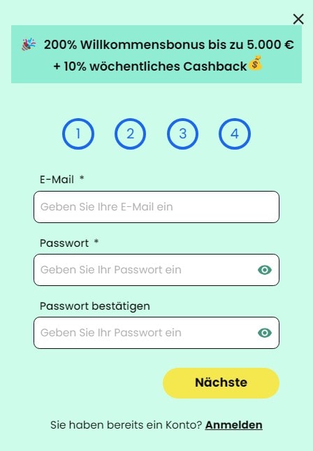 Daraufhin öffnet sich in der Mitte des Screens ein Formular, in dem Sie ihre Zugangsdaten eingeben und persönliche Angaben machen können. Der aktuelle Welcome Bonus wird dabei automatisch für Sie ausgewählt.