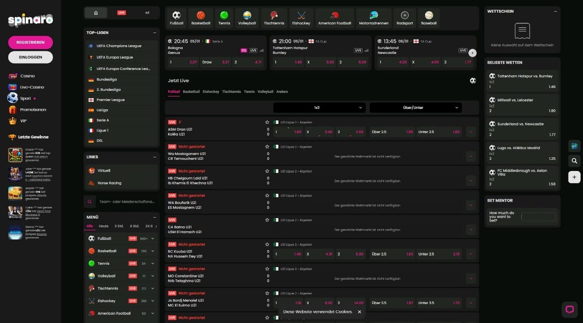 Mithilfe verschiedener Filter können Tipp-Fans sofort nach besonders beliebten Begegnungen suchen, aber sich auch Favoriten abspeichern oder mit einem Klick in aktuelle Livewetten wechseln. Mit über 35 angebotenen Sportarten fällt die Wettauswahl bei Spinaro besonders groß aus.