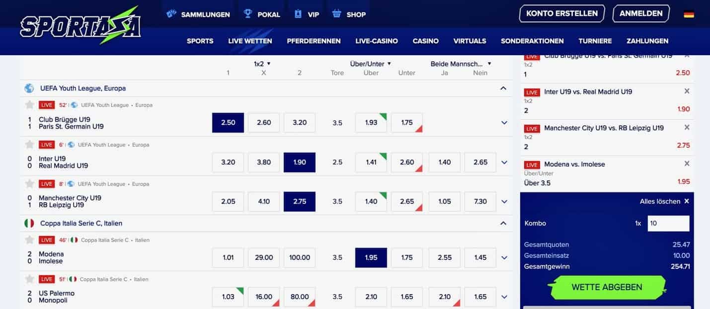 Unsere Sportaza Erfahrungen rund um die Wettmärkte waren ausgezeichnet. Sportaza ist eben einer der besten Wettanbieter. Bei einem Fußball-Bundesligaspiel haben wir teilweise mehr als 16.000 (!) verschiedene Wettoptionen gefunden. Diese können Sie aufrufen, wenn Sie hinter der jeweiligen Partie auf das Dropdown-Menü klicken. Sie finden nicht nur die Drei-Wege-Wette, sondern auch Handicap-Wetten, Über- und Unterwetten, die doppelte Chance oder aber auch Langzeitwetten und Live-Wetten.