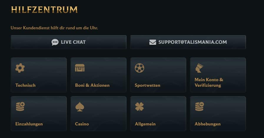 Lobenswert ist die FAQ-Sektion mit acht unterschiedlichen Rubriken von “Technik” über “Mein Konto und Verifizierung” bis zu “Einzahlungen & Abhebungen”. Hier werden die wichtigsten Fragen im Zusammenhang mit Talismania Sportwetten und dem Talismania Casino zum Teil sehr ausführlich beantwortet.