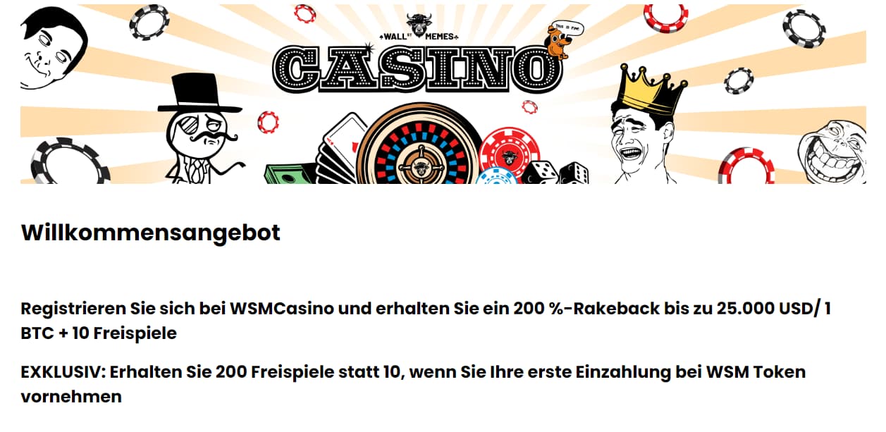 Es gibt einen WSM Casino Bonus für neue Kunden. Hierbei hast du die Chance auf einen 200% Rakeback bis u 25.000 USD / 1 BTC. Dazu kommen 10 Freispiele für den Slot „Wanted Dead or a Wild“ von Hacksaw Gaming. Zahlst du jedoch mit dem WSM-Token ein, erhältst du exklusiv 200 anstelle von 10 Freispielen.