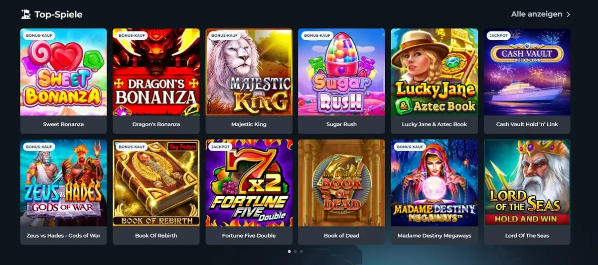 Dominiert wird das Winsane Casino Spielangebot von den Slots. Das Echtgeld Casino hat alle Automaten-Ausführungen auf dem Bildschirm, angefangen vom 3×3 Walzen-Slot bis hin zum Cluster-Spiel, ohne Gewinnlinien und Reels. Jedermann wird fündig. Die Spielautomaten erstrecken sich von der niedrigsten bis zur höchsten Volatilität. Zahlreiche der Winsane Casino Spielautomaten verfügen über die neue Bonus Buy Funktion, unter anderem Bank Robbers, Aztec Legends, Axe Max oder Zeus Fortune.
